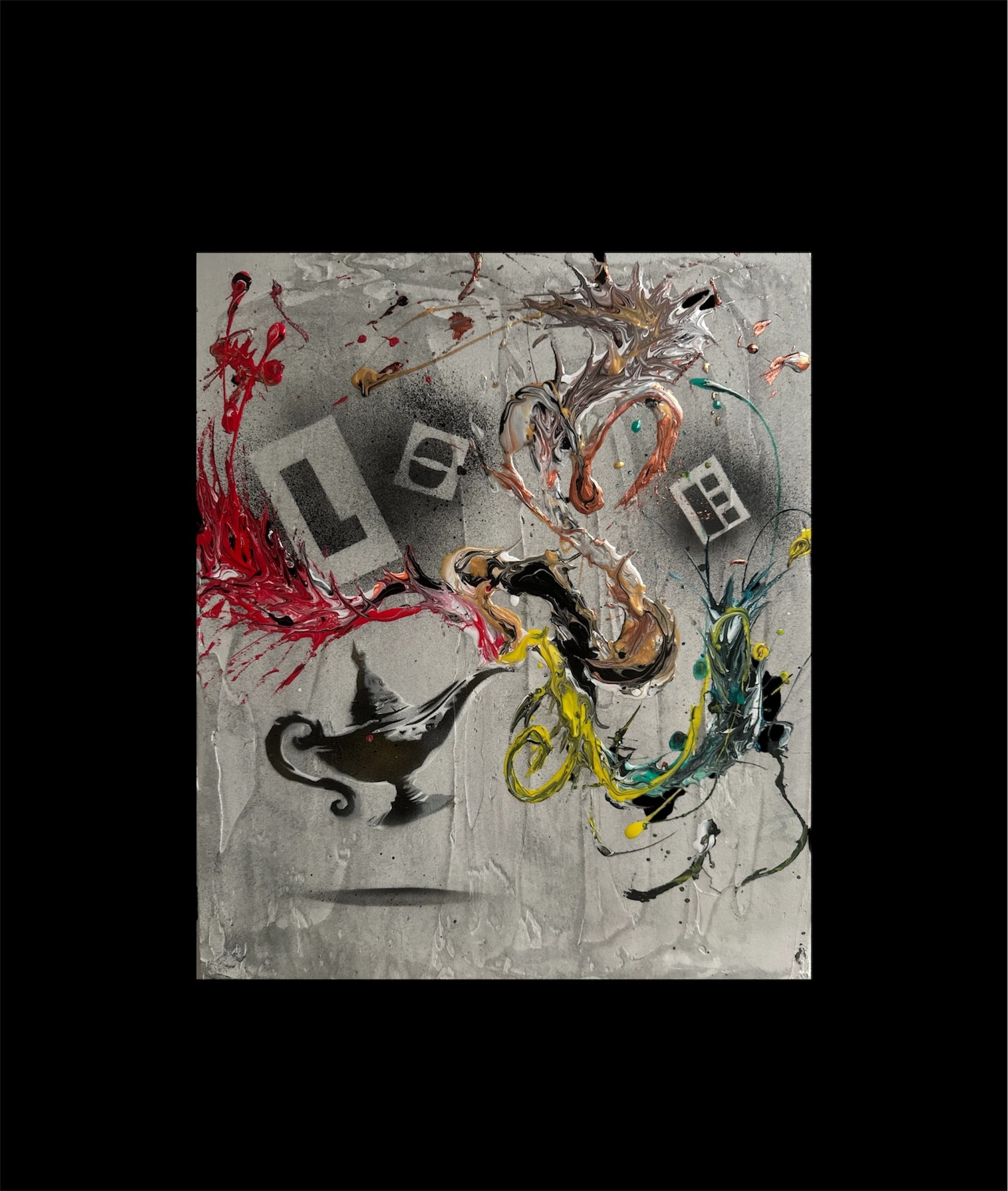 スプレーのストリート感とアクリル絵の具の繊細な表現が特徴的。